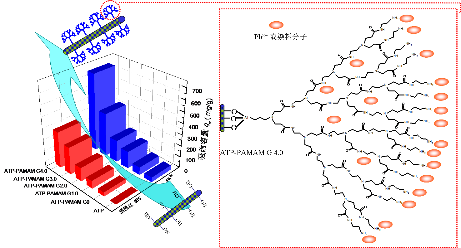 通过共价键、配位键等化学键合作用,制备了系列凹土(ATP)基纳米杂化材料,通过接枝聚丙烯酰胺及聚酰胺-胺(PAMAM)树枝状分子,设计并制备对典型重金属离子和有机染料具有高选择性吸附的系列新型吸附材料,研究了材料表面结构和吸附性能之间的构效关系,探讨了其对重金属离子和有机染料的吸附和脱附机理,为设计和制备具有高选择性、高吸附容量和易再生吸附材料提供实验和理论支撑。