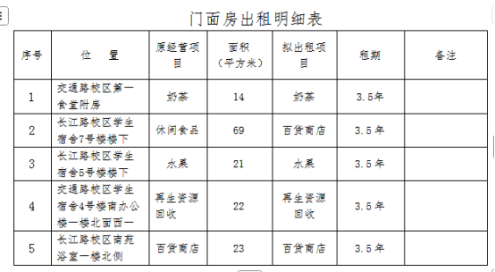 为更好服务学生,并进一步提高我校门面房使用效率。经校长办公会议研究通过,近期拟对部分(5处)门面房对外出租。