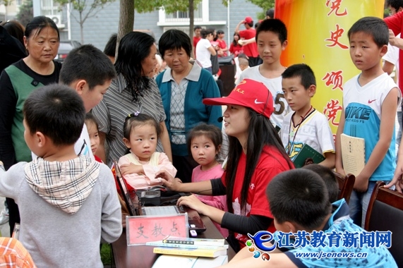 一批80后暑期党员大学生志愿者带去了他们在学校募集的红色革命书籍,免费发放给社区的孩子们,为他们生动形象的讲述了党的光辉历程和伟绩,与社区里的老人们产生了共鸣。志愿者们在社区开展了“关注民生”调研,发放“人人关注食品问题,家家阻截问题食品”的宣传单,帮助居民警惕食品安全和健康饮食等问题。“忆党史、颂党恩”,暑期大学生志愿者演绎《十里送红军》《我的祖国》等红歌、歌舞,强化了社区居志愿者营造红色主旋律的思想。