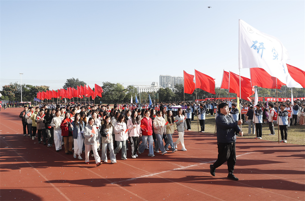 在激昂的运动员进行曲中,国旗、校旗、会徽、红旗、裁判员、二级学院、研究生、机关、后勤集团、图书馆、离退休方阵依次入场,精神饱满地走过主席台。