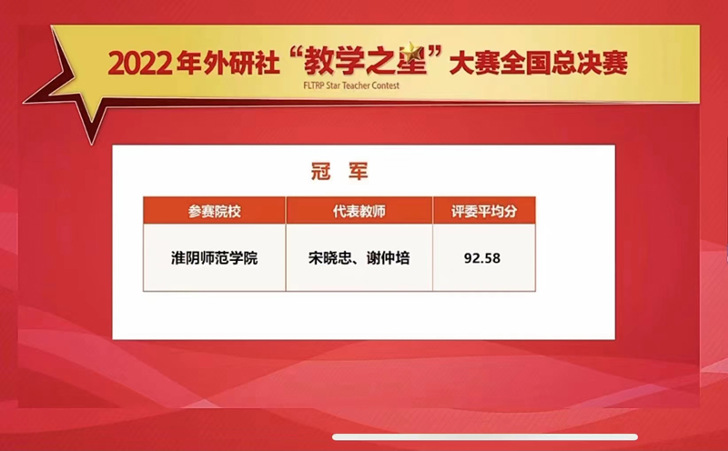 淮师新闻网12月11日电(记者郭成玉)12月9日,2022年外研社“教学之星”大赛全国总决赛于线上举办,淮阴师范学院外国语学院宋晓忠、谢仲培两位老师为代表的参赛团队荣获冠军。本次大赛通过全国半决赛产生的17组特等奖参赛团队相聚云端,绽放教学智慧,尽展育人风采,近2万名教师在线观摩交流。