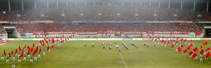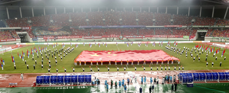 伴随着青年学生如潮水般奔涌汇合,一面巨幅五星红旗在绿茵场中央庄严展开。烈烈红旗下,全体演员齐声高唱《歌唱祖国》,深情而铿锵的歌声响彻夜空,将全场氛围推向最高潮。整齐划一的动作、汇聚如一的歌声,生动展现出众志成城、力挺家乡的团结气势。红色基因所孕育的团结一心、顾全大局的精神力量,在这一刻化作磅礴伟力,激励着每一位球员奋勇争先、迎风前行!