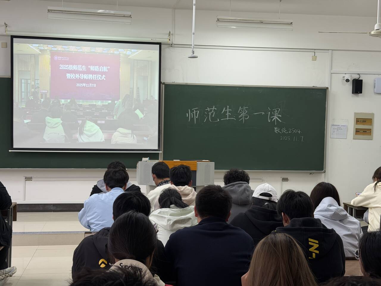 2025级师范生代表、文学院唐泓韵作了表态发言,现场全体师范生进行了集体宣誓,2025级其它班级师范生通过网络直播方式聆听报告。