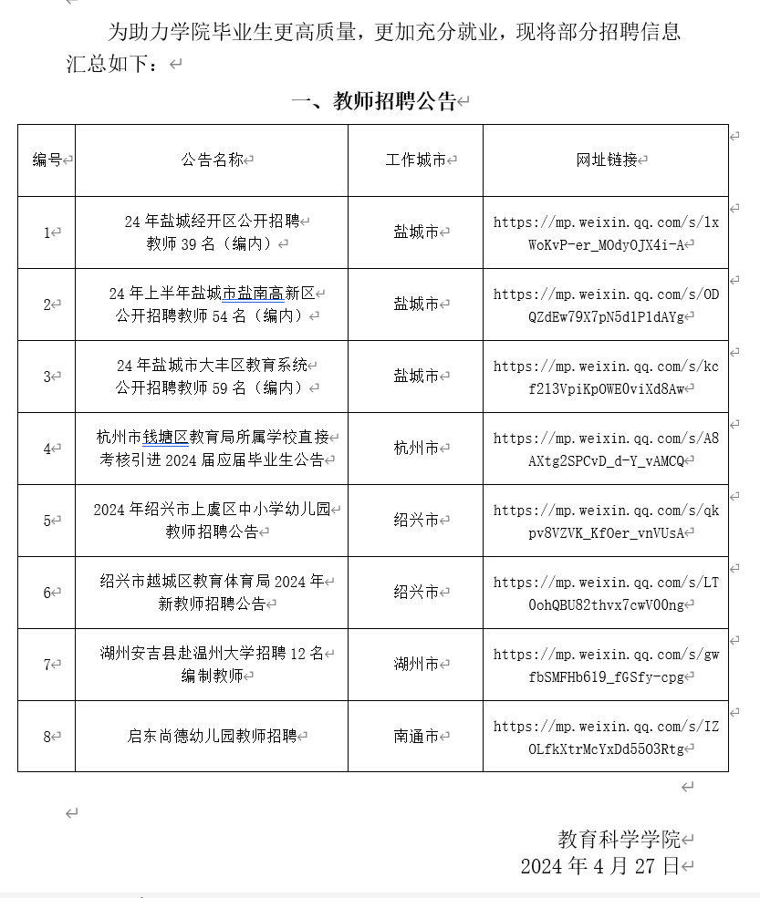 教育科学学院2023-2024学年第二学期第10周招聘信息