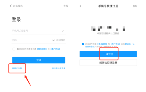 2、在登录页面点击“新用户注册”,使用手机号一键注册。
