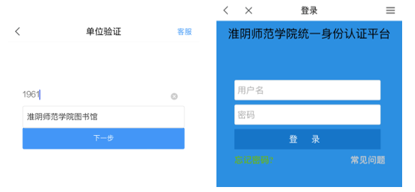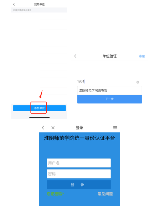 2、点击“添加单位”,输入“1961”,点击下一步,输入学校统一身份认证的账号密码,完成绑定单位。