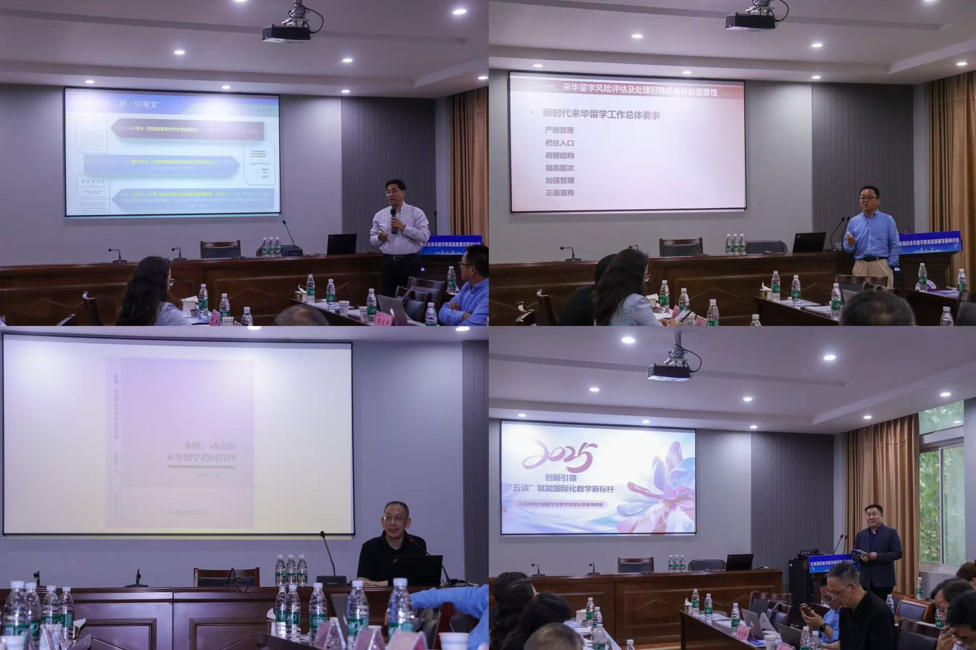 学术报告环节中,江苏留管会咨询专家金泉元教授、龚晓斌教授,以及南京师范大学的王大平教授、南京邮电大学的徐欣教授,结合自身丰富的工作实践案例及深入的学术理论研究,分别围绕来华留学教育质量认证、趋同化管理、风险评估及危机处理、教学观摩比赛赛事解读等主题精彩开讲,精彩纷呈,发人深省。在交流研讨环节,在淮各高校留管工作负责人、教师代表对本校留学生工作开展情况及特色举措、面临的困难与挑战、对未来工作的思考与谋划进行了充分而热烈的交流分享,碰撞出了多元丰富的思想火花。