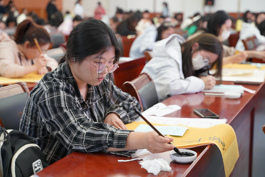 淮师新闻网4月19日电(记者栾旭伦)为进一步挖掘和弘扬典籍中蕴含的宝贵精神,4月17日下午,校统战部和图书馆联合举办的“书写国学经典 筑牢民族精神”第二届国学经典百人抄写大赛在长江路校区图书馆多功能厅举行。来自全校百余名传统文化爱好者参加了此次活动。