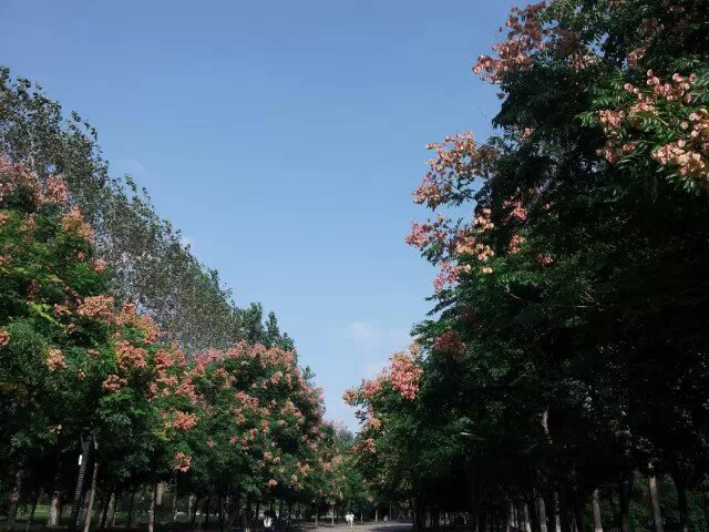 9月底的校园,蔚蓝的天空下,茂盛的香樟树上红红的花朵,给美丽的校园增添了更加迷人的画面