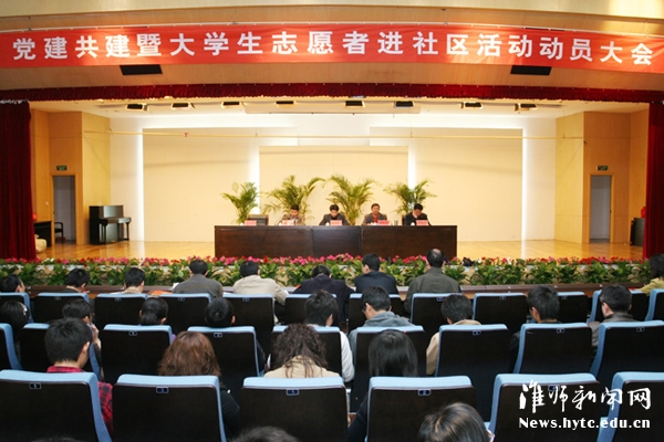 我校的34支青年志愿者服务队500余名同学将进驻淮安市清河区、淮阴区的众多社区,大学生们当起了社区工作的指导员!这是4月9日下午我校党建共建暨大学生志愿者进社区活动动员大会现场获得的消息。报告会在图书馆报告厅召开,由团委书记朱延华主持。校大学生志愿者进社区开展党建共建活动工作领导小组成员及各个系科的青年志愿者们参加了会议。