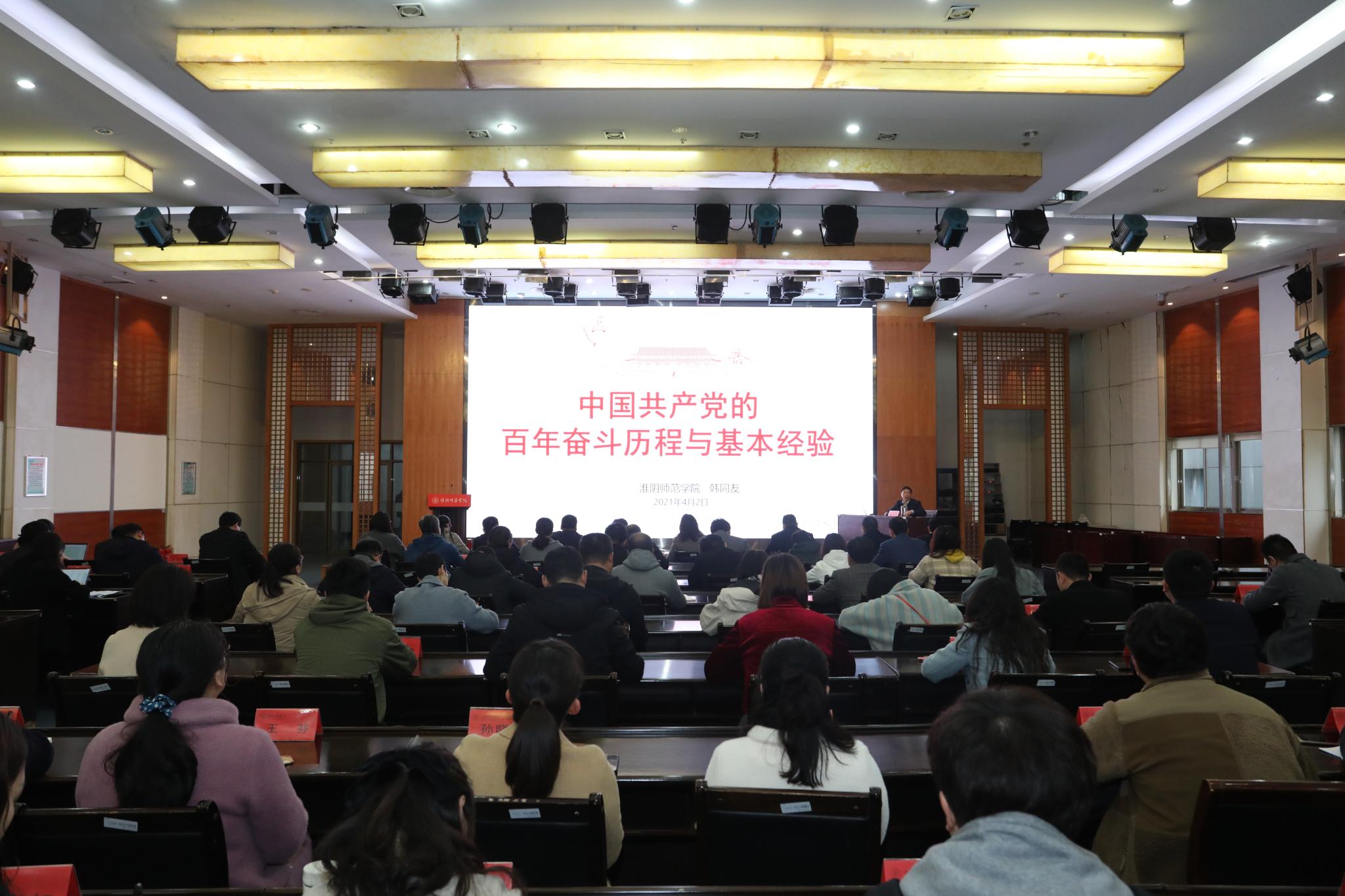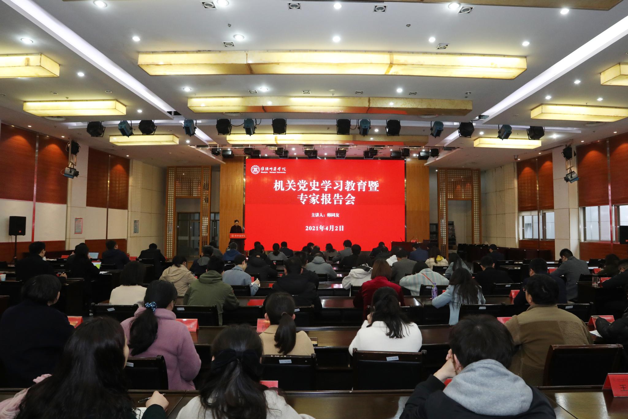 淮师新闻网4月2日电(记者孙珊)4月2日下午,淮阴师范学院机关党委在长江路校区图书馆多功能厅召开党史学习教育动员暨专家报告会,邀请校党史学习教育宣讲团成员、副校长韩同友为大家开展党史学习教育专题辅导讲座。机关党委委员、党支部书记、支委及党员代表、研究生党员代表等100余人参加了会议。会议由机关党委书记王江明主持。