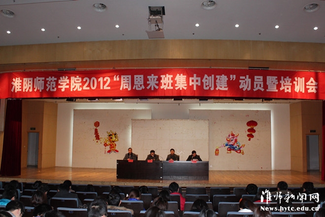 翔宇通讯社2月29日电(记者刘晓乾 孙家会 董晗)2月28日下午,淮阴师范学院2012“周恩来班集中创建”动员暨培训会在图书馆学术报告厅成功举行。出席本次会议的领导有:校周恩来研究会会长王家云、党委宣传部部长朱延华、团委书记毛广雄。各创建班级班长、团支书应邀参加本次会议。校团委副书记闫超栋主持此次培训会。