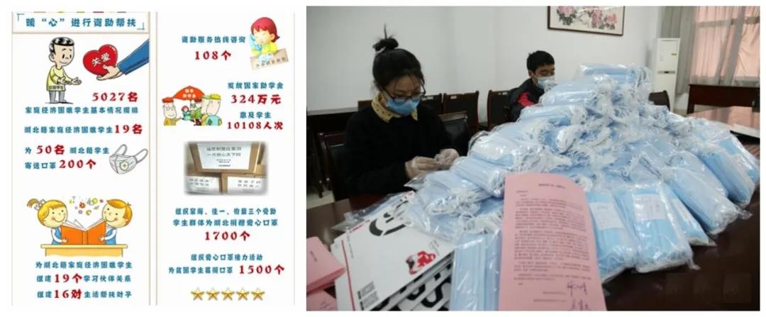做精资助服务。资助中心及时启动新型冠状病毒肺炎疫情防控资助绿色通道,开通“临时补助直通车”“困难认定直通车”“助学金发放直通车”,对因疫情造成生活困难的25名学生及时拨发2月份国家助学金162.842万元。针对毕业学生启动了助学贷款还款救助机制。为疫情严重地区、建档立卡学生寄送口罩2015只。