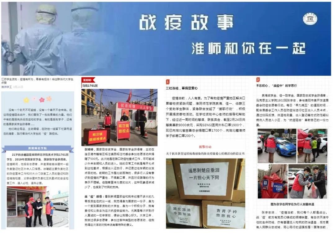 树好方向标。充分发挥学生党员、学生干部、退伍士兵、国奖获得者等先进群体在战疫中的作用,通过榜样示范,助推更多的学生在主题教育中受教育、长才干、作贡献。淮阴师范学院目前有5名退役士兵奋战抗疫一线,百余名国家奖学金、励志奖学金、国家助学金获得者主动参与当地疫情防控,两百余名学生干部、党员活跃在基层一线战疫。泉海、佳一、伯藜三社连枝,为疫区寄送1700只口罩。