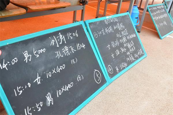 体育部是运动会时期最为忙碌的一个部门之一,小到挑选学院各项比赛的运动员、安排运动员的赛前训练,大到负责整场运动会的进度协调工作,他们都参与其中。在学院搭建的临时休息点处,他们细心地把比赛日程抄写在小黑板上,确保各项比赛的检录工作细致有序。