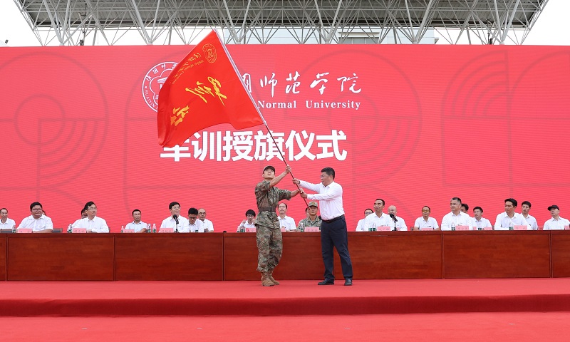图为校长赵宜江为军训旅授旗。记者唐瑀摄