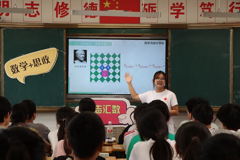 实践团成员走进钱集中学开展数学思政课,给学生讲述勾股定理奥秘的同时,融入了五星红旗的故事。活动中,实践团成员从周恩来故事、数学趣味故事、暑期安全、学习经验分享等四个方面依次展开,旨在帮助钱集中学学生度过一个充实且有意义的暑假。他们重温总理故事,共同感悟艰苦奋斗的周恩来崇高精神风范;他们学习卫朴、叶金毅等数学家们的优秀品质,在榜样的力量中不断前行;在学习经验分享会中,他们帮助中学生找到适合自己的学习方法,勉励同学们要严格要求自己,争做自律、自强的新时代中学生。此外,团队成员聚焦生活点滴,向大家普及暑期安全知识,开展安全教育活动。