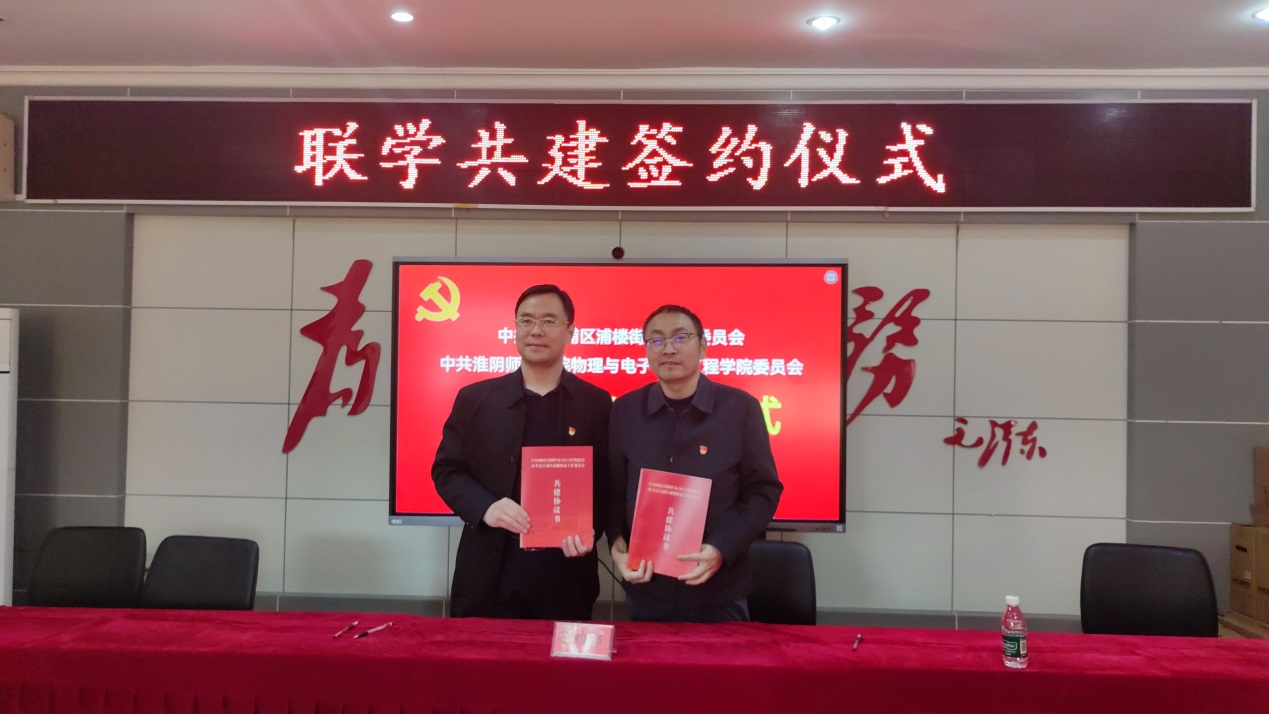 淮师新闻网11月21日电(记者吴宣 叶梓隆 丁昊阳)11月19日,物电学院党委与清江浦区浦楼街道党工委联合举办“党建引领聚合力,政校企协同促发展”主题党日活动,双方共同签署《党建联学共建协议》。清江浦区浦楼街道党工委书记李延清、副书记马丹,物电学院党委书记刘仁明、院长李清波及师生党员代表参加活动。