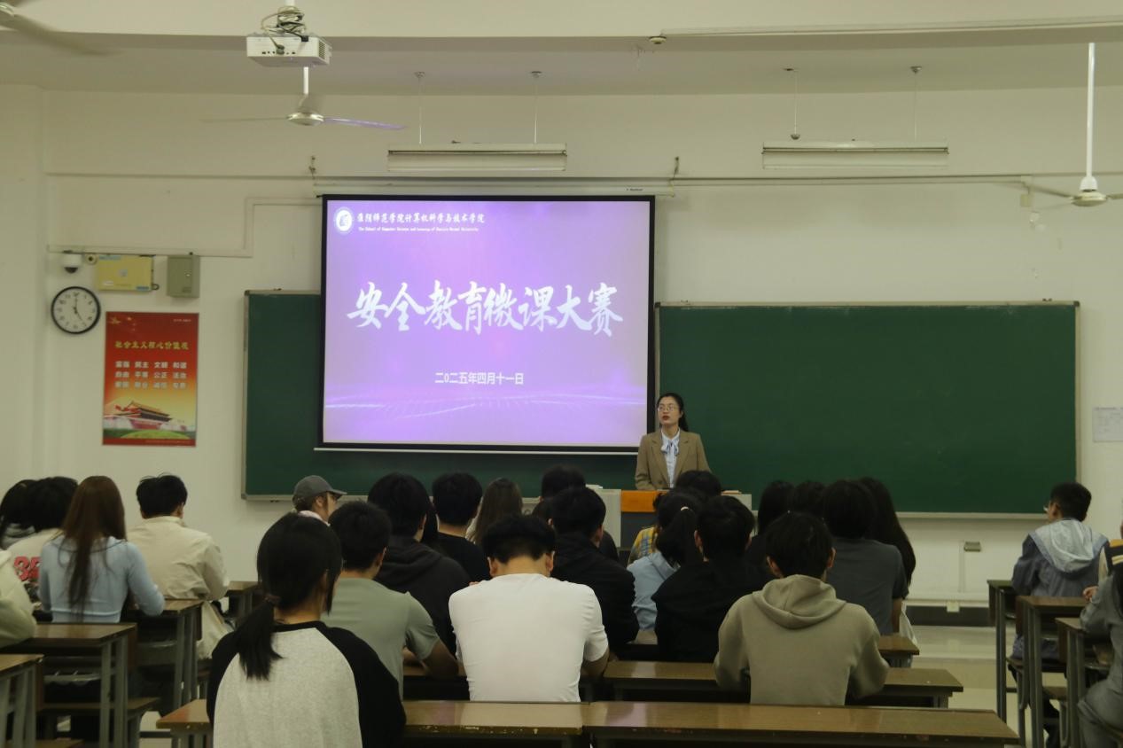 淮师新闻网4月14日电(记者曾佳慧)为深入学习贯彻总体国家安全观,全面提升大学生安全意识、安全素养和安全防范能力,4月11日晚,计算机科学与技术学院在理工南楼103教室举办安全教育微课大赛,来自全院22、23、24级共计17名选手参加比赛,各班学生代表现场观摩。